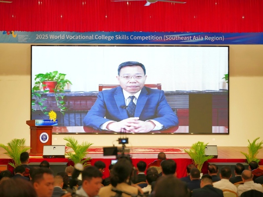 彭斌柏以视频方式致辞。他首先向本次大赛的成功举办表示热烈祝贺。他表示,近年来,中国大力发展职业教育,形成了具有中国特色的职业教育发展模式。中国愿意与世界各国分享中国职业教育的发展经验。举办世界职业院校技能大赛,目的就是搭建高水平技能比拼擂台。通过大赛推进产教深度融合,提升服务产业发展能力,吸引更多国家及企业、学校参与,推动理念、标准、资源共建共享,打造职业教育国际交流合作新平台。今年大赛首次开设东南亚赛区,各国选手同台竞技,展示了精湛技能,开展了形式多样的人文交流活动。近年来,中柬双方已实施29个职业教育合作项目,特别是2023年12月,中国77779193永利官网和柬华理事总会共建的柬华应用科技大学正式成立,首批10个本科专业开始招生。这是中柬教育合作的代表性成果。此次大赛架起了跨越国界的技能桥梁,向世界展示了柬埔寨及东南亚各国职业教育的活力与潜力,也为中柬青年交流搭建了新的平台。