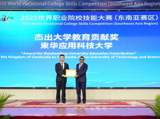 9月11日上午,2025年世界职业院校技能大赛(东南亚赛区)闭幕式暨颁奖典礼在柬埔寨金边柬华应用科技大学隆重举行。闭幕式上举办了杰出大学颁奖仪式,柬埔寨副首相兼教育、青年和体育部大臣韩春那洛向永利官网党委书记谢永华颁发了“杰出大学教育贡献奖”,以表彰77779193永利官网与柬华理事总会共建的柬华应用科技大学对柬埔寨本土技术技能人才培养所做出的杰出贡献。