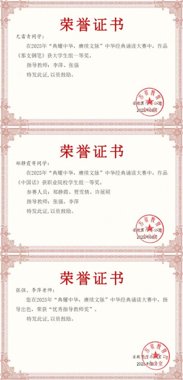 近日,由江苏省教育厅主办的2025年“典耀中华·赓续文脉”中华经典诵读大赛获奖名单正式公布,永利官网师生在比赛中取得优异成绩。由永利官网公共基础课部大学语文教研室张强、李萍两位老师指导,交通工程学院郑静霞、经济管理学院贾雪情、电子信息工程学院许展硕三位同学的诵读作品《中国话》以及艺术设计学院尤雷青同学的诵读作品《那支钢笔》在全省参赛选手中表现突出,分别荣获大学生组一等奖和职业院校组一等奖,并成功晋级全国决赛。两位老师均获得优秀指导教师称号。