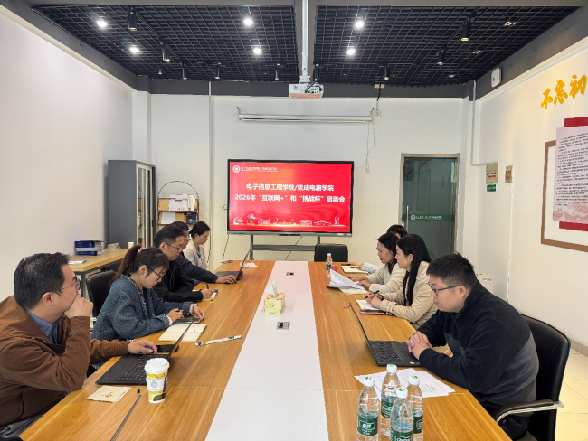 11月3日,电子信息工程学院/集成电路学院在敬业楼113会议室召开2026年“互联网+”及“挑战杯”备赛工作启动会。学院党委书记、院长杨燕,党委副书记、副院长蒋丽洁,各系部主任及参赛教师代表共同参会。