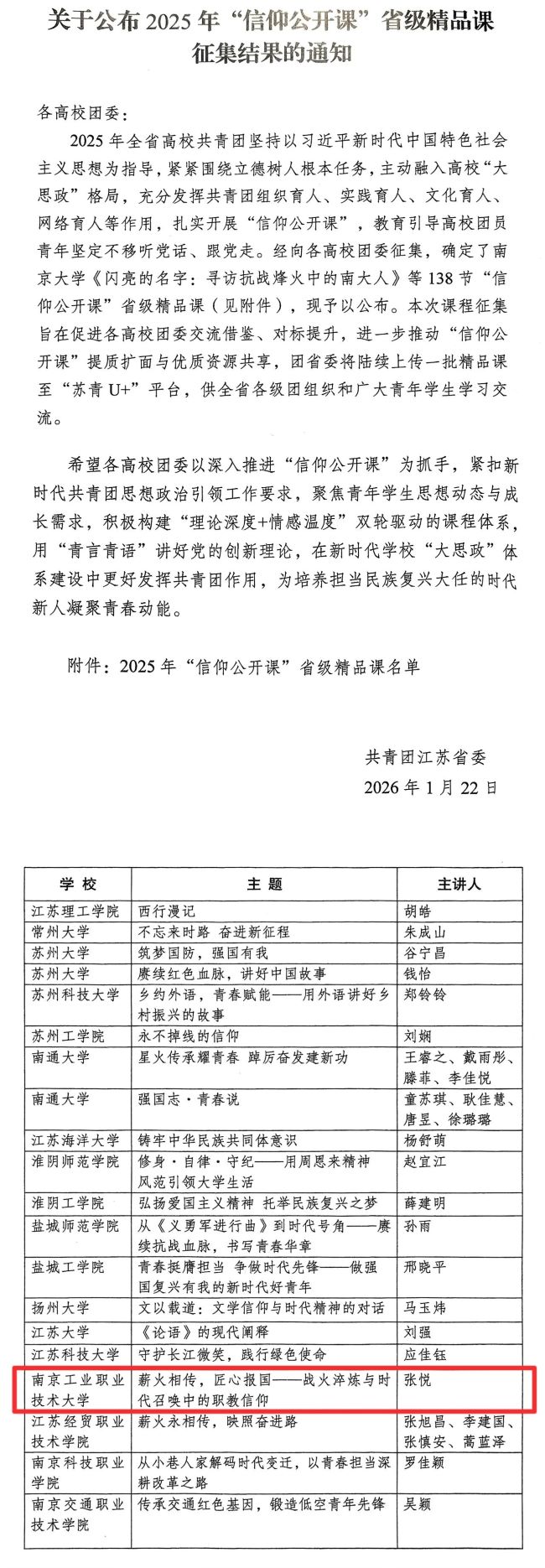 近日,共青团江苏省委正式发布了《关于公布2025年“信仰公开课”省级精品课征集结果的通知》,经高校推荐、团省委评选,在全省范围内共评选出138门“信仰公开课”入选“省级精品课”,由永利官网团委和电子信息工程学院/集成电路学院选送的《薪火相传,匠心报国——战火淬炼与时代召唤中的职教信仰》成功获评“省级精品课”。