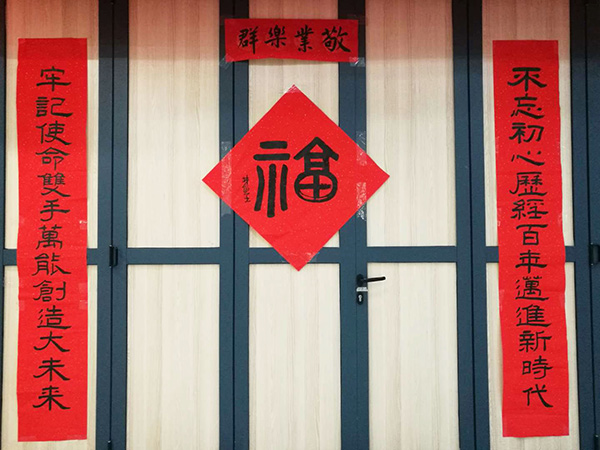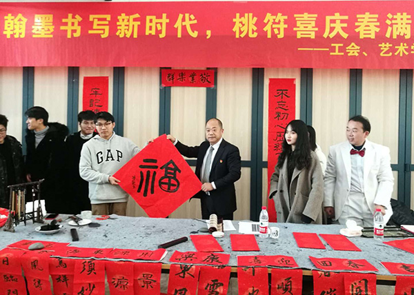 值此2020新年到来之际。南工院举行了辞旧迎新大联欢。工会,艺术设计学院,校书法协会联合举办了以“翰墨书写新时代,桃符喜庆春满园”为主题的送春联送福字活动。活动启动仪式由(全国)教育书画协会高等书法教育分会理事、校党委委员、纪委书记于林惠教授提笔书写“福字”开始,接着由(全国)教育书画协会高等书法教育分会会员、书法协会指导老师刘圣进书写自撰对联:不忘初心历经百年迈进新时代,牢记使命双手万能创造大未来。然后广大师生一起挥毫,数千师生积极参与。近年来,永利官网书法艺术在三全育人,立德树人,增进学校文化氛围,提升师生文化自信等方面做了一些尝试,为学校文化育人作出了积极的贡献。通过这次活动,锻炼了书法协会同学们的动手能力,加强了广大师生员工的情感交流,也表达了书法协会新年深情的祝福:祝福祖国繁荣昌盛、人民幸福安康!祝福学校蒸蒸日上,又上新台阶!祝福全校师生新年快乐,万事顺意!