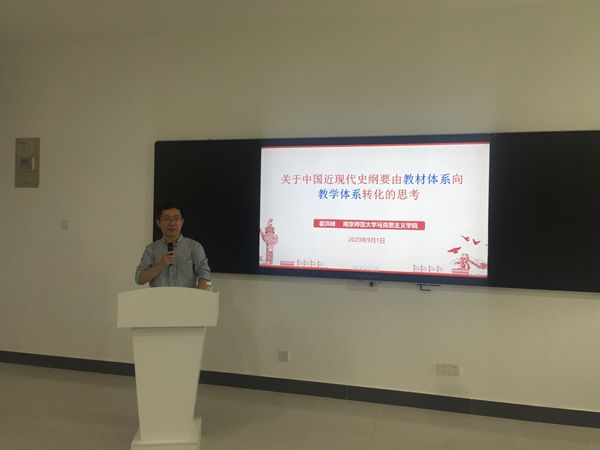 翟洪峰报告的题目是《关于中国近现代史纲要由教材体系向教学体系转化的思考》。他从教材体系和教学体系的区别与联系,南京师范大学思政课围绕“转化”开展的教学改革的历程和取得的成果,专题化教学的优势、成效、基本原则及存在的问题、改进和完善等方面给老师们作了精彩的报告。这次报告,对马克思主义学院教师的专题化教学能力、教学水平及课堂整体效果起到了良好的促进作用,是加强深化思政课建设,牢固树立思政课是落实立德树人关键课程的重要举措。
