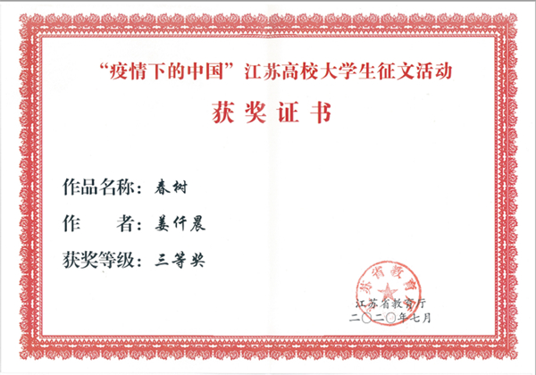 自活动开展以来,全校学生积极参与,经各学院初审,学校评选,共推选参评3篇征文作品,作品记录了同学们在疫情防控期间的难忘时刻和心路历程,讲述了抗疫期间人与人之间的温暖善意和真挚情感,书写了身边的抗疫感人事迹,强化责任与担当,树立爱国主义情怀,坚定决胜信心,传递出众志成城、共克时艰的强大正能量。最终永利官网电气工程学院电气1814班李钱鹏同学的文章《送别》获得了省赛二等奖,建智1911班姜仟晨同学的文章《春树》获得省赛三等奖。