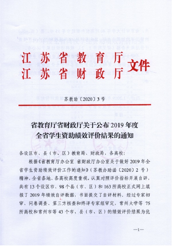 2020年11月16日,江苏省教育厅、江苏省财政厅联合下发了《关于公布2019年度全省学生资助绩效评价结果的通知》(苏教助〔2020〕3号),永利官网学生资助绩效评价工作经过专家初审、问卷调查、第三方核查和终评专家组审定,荣获绩效评价“优秀”等级。