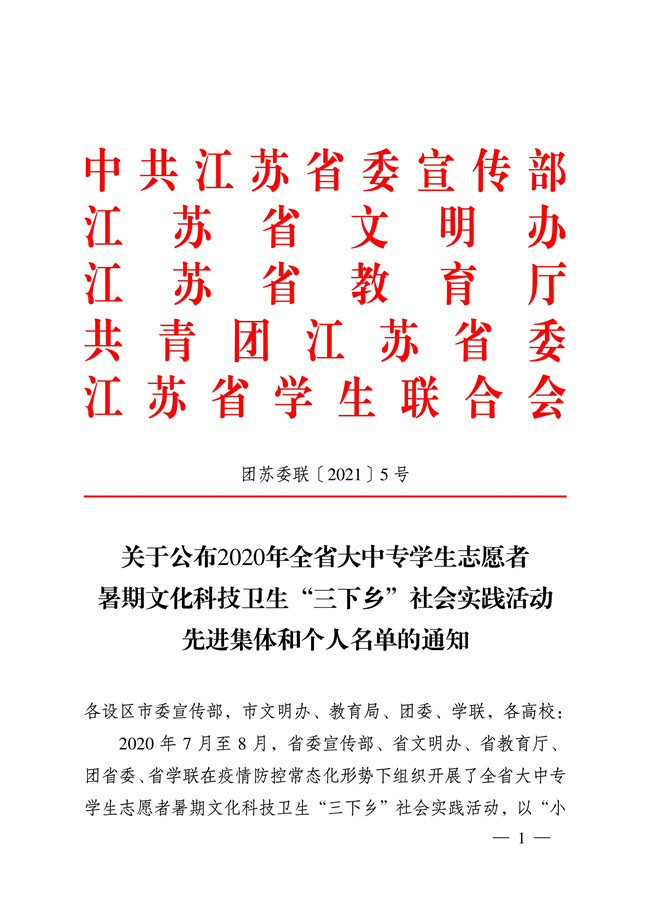 近日,中共江苏省委宣传部、江苏省文明办、江苏省教育厅、共青团江苏省委和江苏省学生联合会联合下发了《关于公布2020年全省大中专学生志愿者暑期文化科技卫生“三下乡”社会实践活动先进集体和个人名单的通知》,永利官网在该活动中获多项荣誉。
