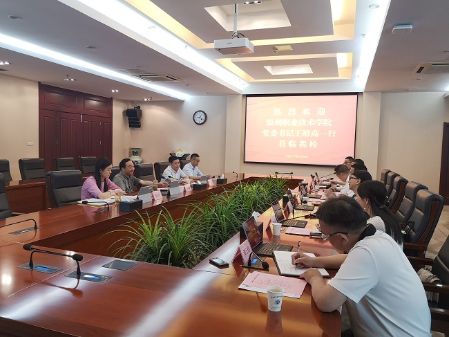 6月10日上午,温州职业技术学院党委书记王靖高一行来永利官网考察调研。党委书记吴学敏,以及党委办公室、校长办公室、教务处(教师发展中心)等部门负责同志在行政楼辅楼一楼会议室接待了来宾。