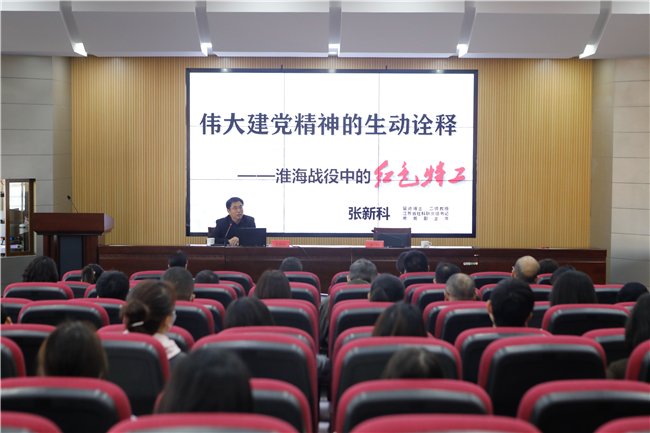 报告会上,张新科书记以《伟大建党精神的生动诠释——淮海战役中的红色特工》为主题,从淮海战役的“正面战场”“支前民众”和“隐蔽战线”三个方面,介绍了淮海战役的历史背景和主要事件,重温了以郭汝瑰、刘君湘、钱树岩、萧德宣等为代表的红色特工们可歌可泣的英雄事迹。他通过讲述这些隐蔽战士们生动形象的革命故事,将淮海战役的历史画卷徐徐展开,彰显了中国共产党领导的人民军队取得淮海战役伟大胜利不仅是民心所向,更是历史的必然。红色特工们坚定的革命信仰深深地感动着现场的每一位师生。师生代表们表示,此次报告触人灵魂、引人深思、催人奋进,让大家深深体会到正是在山河破碎、民不聊生之时,中国共产党乘着一叶红船、载着革命星火,于风雨飘摇中带给中国人民和中华民族以生的希望。