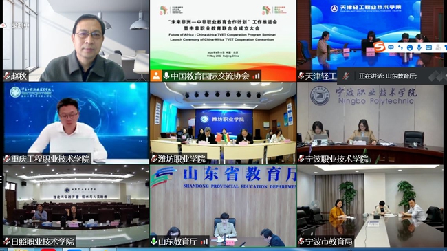5月11日,“未来非洲—中非职业教育合作计划”工作推进会暨中非职业教育联合会成立大会在线上举行,教育部国际合作与交流司副司长贾鹏,非洲技术与应用型大学与学院协会秘书长扎哈·法勒,中国教育国际交流协会副秘书长余有根,坦桑尼亚教育科技部职业教育司司长诺埃尔·姆邦德,中国驻埃及大使馆教育公使衔参赞王胜刚,埃及驻华大使馆文化教育参赞乌麦伊麦·迦尼姆,中国驻南非大使馆教育参赞李旭东,中国驻非盟使团政治事务参赞张民敬出席并致辞祝贺。