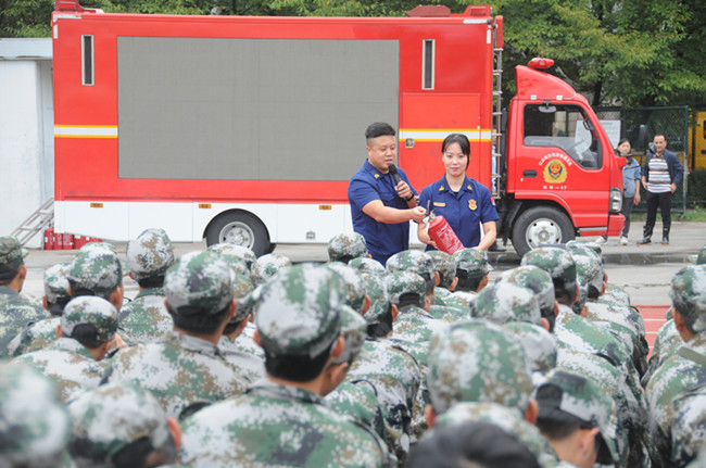 “这是我们最常见的干粉灭火器,大家只要记住四点,一提二拉三对准四消灭,对准火焰的根部,不要对准火焰上面。在灭火过程中要站在火焰的上风向,不要站在下风向,否则会伤到自己。”吴波参谋耐心地向新生传授消防安全知识,用通俗易懂的语言向新生讲解了如何预防火灾、如何正确报警、如何扑救初期火灾、如何正确使用灭火器,以及火灾中如何逃生、自救、疏散等知识,并着重强调了日常火灾防范应注意的有关事项。