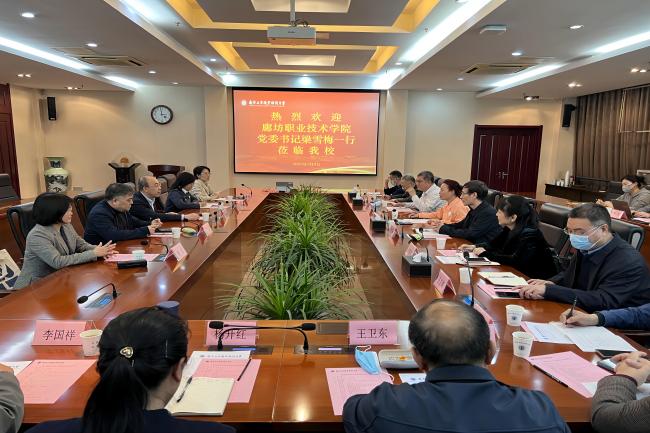 3月8日下午,廊坊职业技术学院梁雪梅书记一行来永利官网考察调研。党委常委、副校长霍雄飞以及相关部门负责同志在行政楼辅楼一楼会议室接待了来宾。