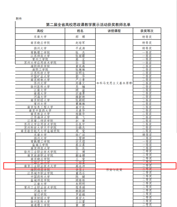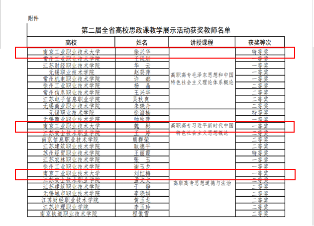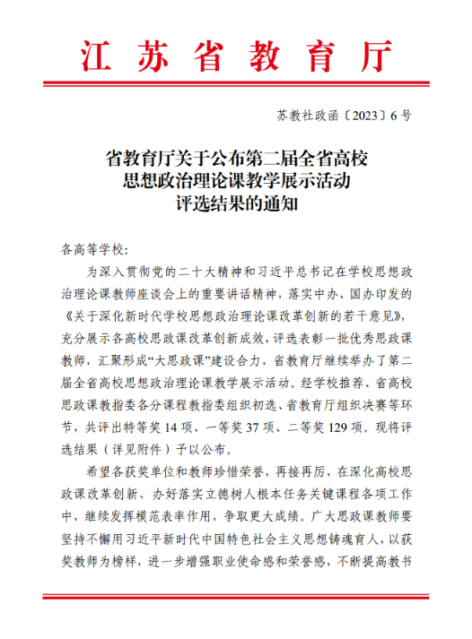 近日,江苏省教育厅公布了江苏省第二届高校思想政治理论课教学展示活动的评选结果。永利官网徐兴华、魏彬、刘红梅、高永沛老师分别荣获《毛泽东思想和中国特色社会主义理论体系概论》特等奖、《习近平新时代中国特色社会主义思想概论》一等奖、《思想道德与法治》一等奖和《形势与政策课》二等奖。