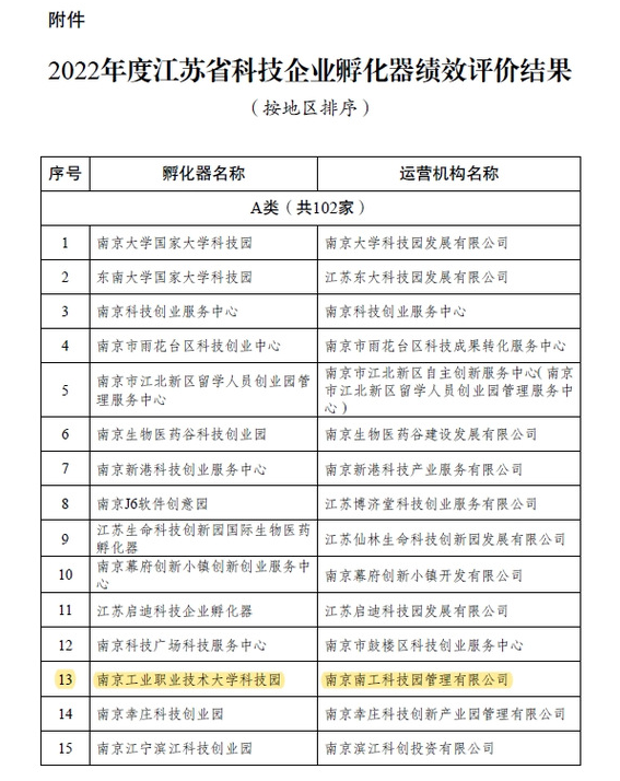 近日,江苏省科学技术厅发布了《省科技厅关于公布2022年度江苏省科技企业孵化器绩效评价结果的通知》(苏科高发〔2023〕186号),77779193永利官网科技园被评为“优秀(A类)”。