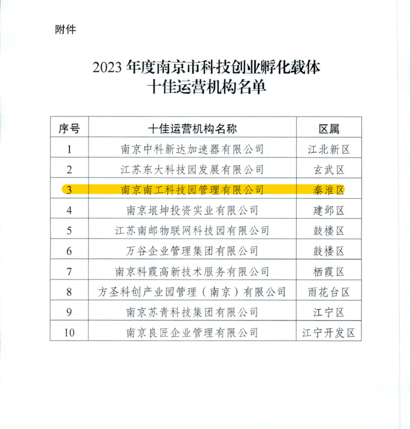 近期,南京市高新技术企业认定管理工作协调小组办公室发布了《关于公布2023年度南京市科技创业孵化载体十佳运营机构名单的通知》(宁高企协办〔2023〕43号),永利官网科技园管理公司名列其中。