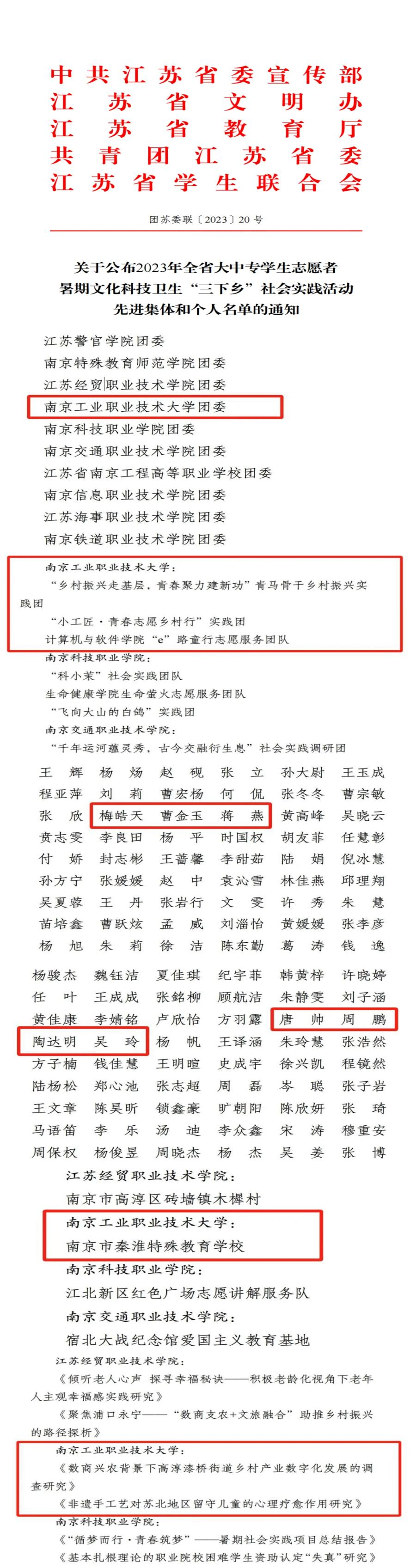 近日,共青团中央及中共江苏省委宣传部、省文明办、省教育厅、团省委、省学联联合会对2023年全国、全省大中专学生志愿者暑期文化科技卫生“三下乡”社会实践活动表现突出单位、团队、个人等项目进行了表彰,永利官网暑期“三下乡”社会实践工作喜获多项国家级、省级表彰。