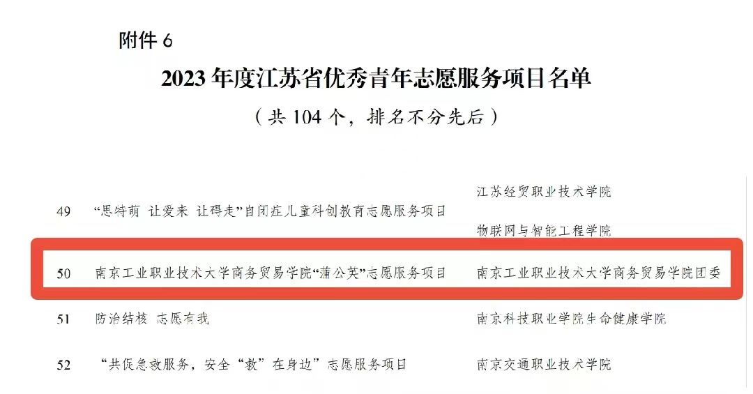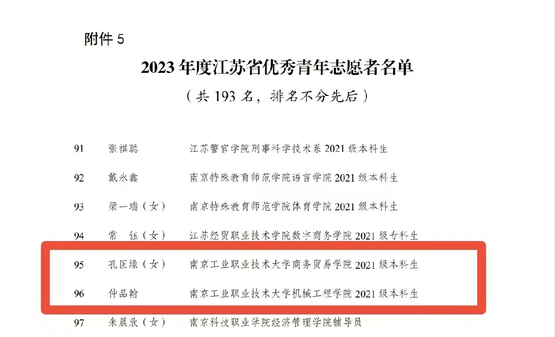 近日,共青团江苏省委、江苏省青年志愿者协会公布了2023年度全省青年志愿者行动先进典型评选结果。永利官网商务贸易学院学生孔匡缘、机械工程学院学生仲品翰获评2023年度江苏省优秀青年志愿者;永利官网商务贸易学院“蒲公英”志愿服务项目获评2023 年度江苏省优秀青年志愿服务项目;永利官网经济管理学院“萤火虫”志愿服务团获2023年度江苏省青年志愿服务行动组织奖;计算机与软件学院团委获评江苏省青年志愿服务事业贡献奖。