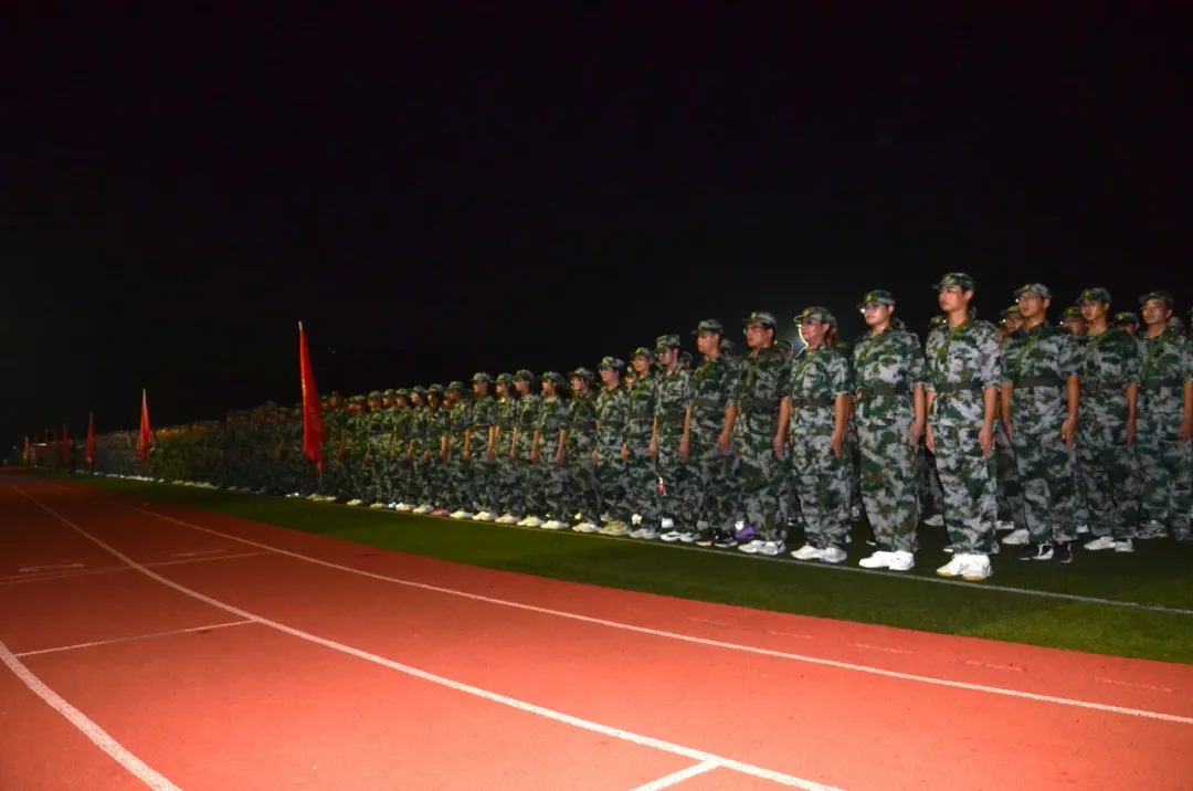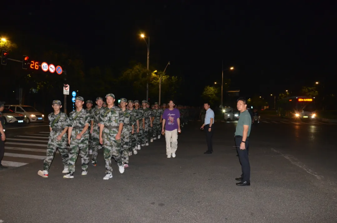 当晚19时30分,全体参训新生在操场集结,军训团团长袁春阳进行动员讲话,为同学们加油鼓气。学校党委常委、副校长魏萍向军训团下达行军任务,宣布拉练正式开始。